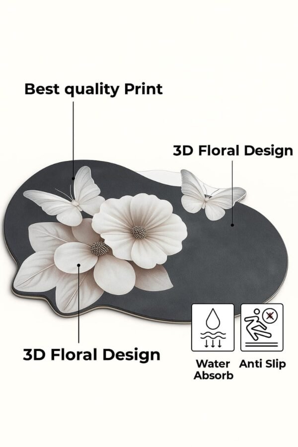 Add a touch of sophistication and comfort to your home with our Elegant 3D Floral Rubber Floor Mat. Showcasing graceful white flowers and butterflies on a sleek grey background, this stylish mat blends effortlessly with modern and minimalist home décor.